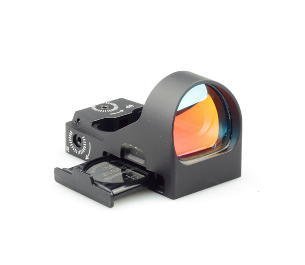 - Питание – прицел работает на 1-ой литиевой батарее типа CR2032 (3В) для замены которой достаточно выдвинуть батарейный латок.