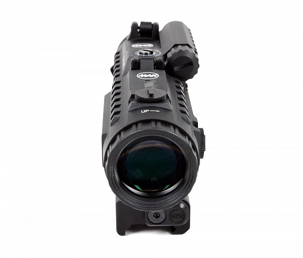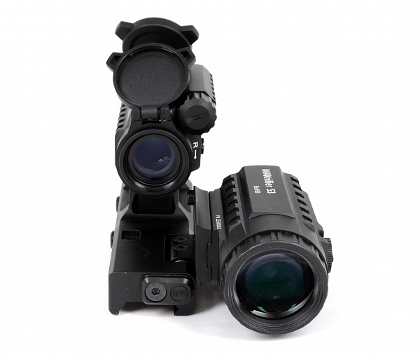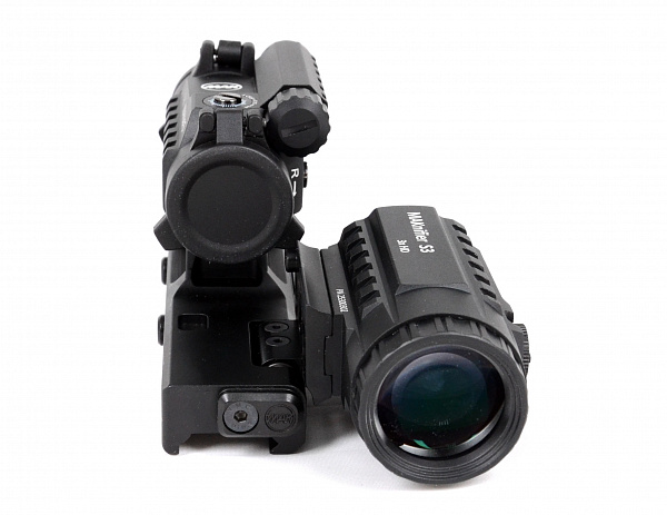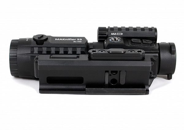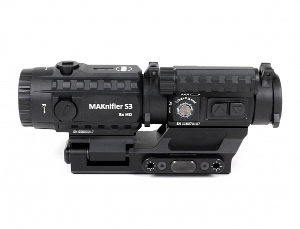 Комплект увеличительная насадка MAKnifer S3 и коллиматорный прицел MAKdot S 1x20 на едином основании MAKmasterLock CS образует цельный единый комплекс для установки на оружие, адаптированное планкой weaver/picatinny. Кронштейн имеет 2 посадочных места. Спереди комплекса на свое посадочное место монтируется коллиматорный прицел, сзади прицела монтируется увеличительная насадка. Увеличительная насадка монтируется на откидную площадку, что позволяет вести прицеливание как непосредственно через коллиматорный прицел с откинутой вбок насадкой, так и через насадку при возвращении ее на место за прицелом.
