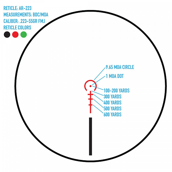 - Прицельная сетка BDC откалибрована для патронов калибра .223 3,56 грамм.